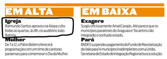Mauro Bonna comentou em sua coluna no Diário do Pará no dia 01/03/2011, sobre a aprovação de cultos evangélicos que serão realizados todas as quartas na ALEPA de 8 às 9 da manhã através de requerimento do Deputado Raimundo Santos.